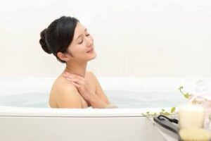 湯船に みぞおちの下まで お湯をはる。 温度は38〜40℃程度のぬるめで、20分ほどゆったり入浴。 全身の血流改善とリラックスでむくみ軽減。