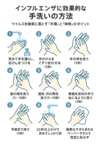 インフルエンザ予防に効果的な手洗いは、**ウイルスを確実に落とす「手順」と「時間」**がポイントです。以下の方法をおすすめします。