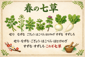 せり なずな(ぺんぺん草) ごぎょう はこべら ほとけのざ すずな(かぶ) すずしろ(だいこん)