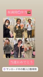 桜満開🌸弁当🍱おめでとう 2026.03.24 ブログ 昨日は桜満開🌸イベントでした。 ご当選おめでとう御座います㊗️ 老舗惣菜屋さんのお弁当🍱を是非お召し上がり下さい♪ #江東区#大島#亀戸#整骨院#接骨院#膝痛 過去の投稿 ≫