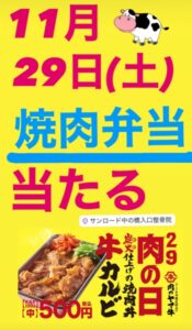 11月29日はいい肉の日🍖と言う事で、焼肉弁当🍱を当選者に配ります。