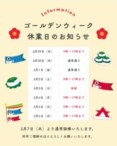 入口整骨院はGWも上記の予定で診療します!